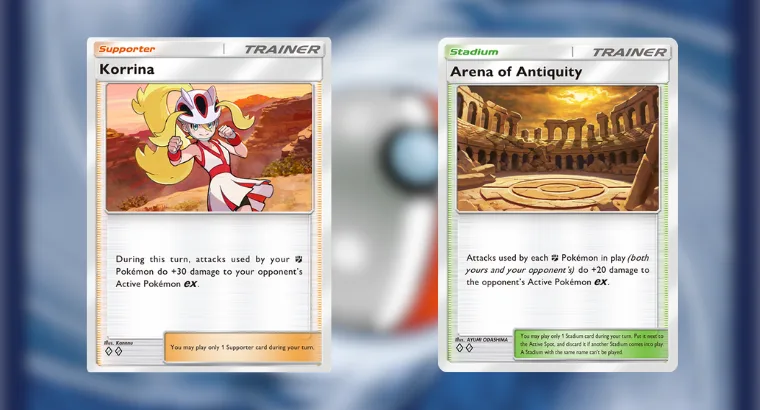 These include a new Supporter, Korrina, who can boost Fighting-Type Pokemon’s attacks against EX Pokemon by 30 points for a single round. There is also a new Stadium card, Arena of Antiquity, which boosts all Fighting-type Pokemon’s attacks against EX Pokemon by 20 damage, and a Field Blower Item card, which allows a player to discard a Stadium Card from the field or another Item card from any Pokemon, including their own. Additionally, players will be able to automatically receive a new gold frame for any cards of one to three-diamond rarity if they own at least 10 duplicates of that card.